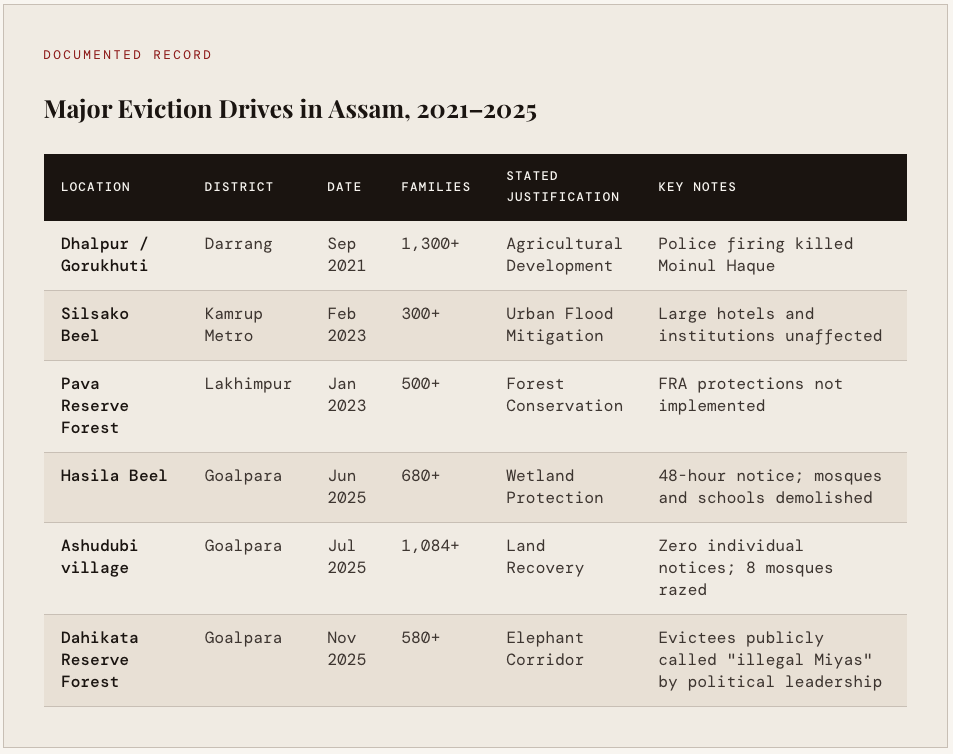 Critically, the government has simultaneously refused to implement the Forest Rights Act, 2006, which prohibits evictions of long-term forest dwellers until rights recognition processes are complete. Many eviction sites - including Pava Reserve Forest in Lakhimpur and Dahikata Reserve Forest in Goalpara — fall squarely within the Act's protections. Instead of recognising rights, the state relies on colonial-era land laws to manufacture illegality: communities are rendered "encroachers" not because they lack rights, but because the state refuses to recognise those rights.