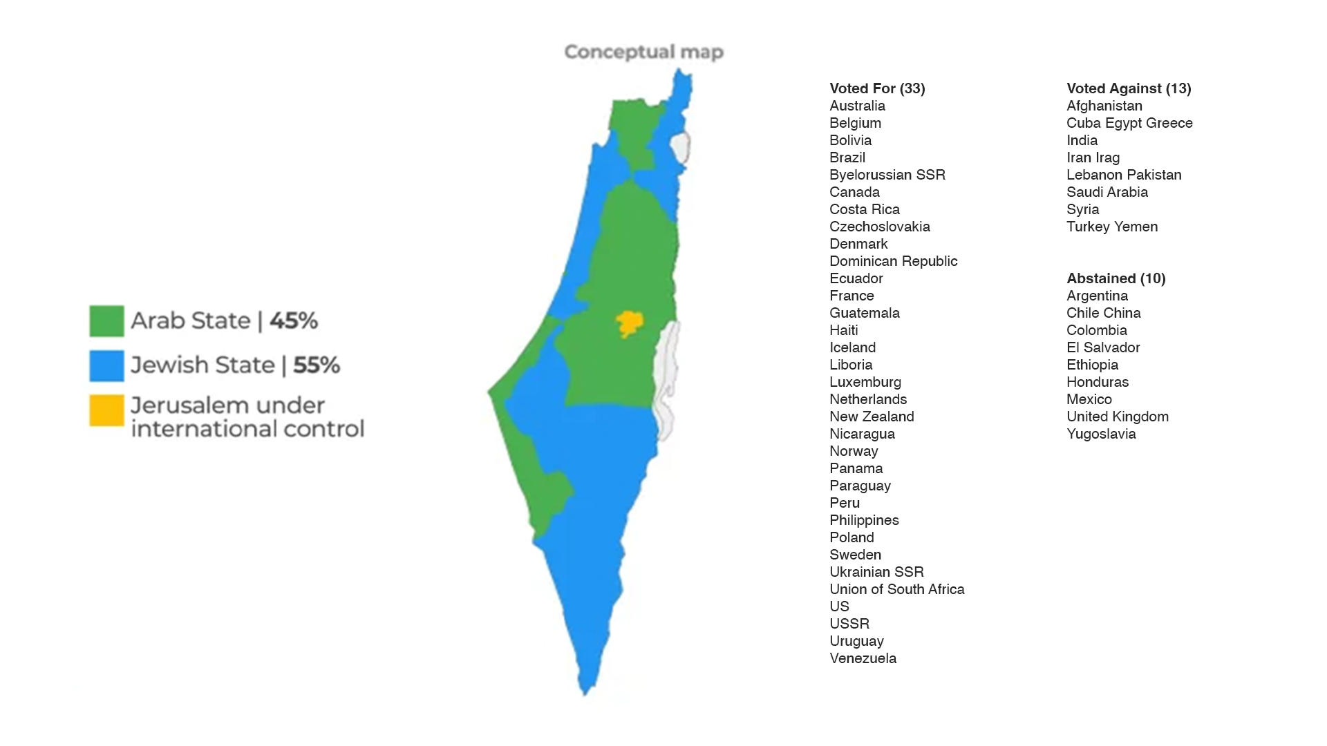 The UN passed Resolution 181 to partition Palestine into two states — one Jewish (55% land) and one Arab (45%).