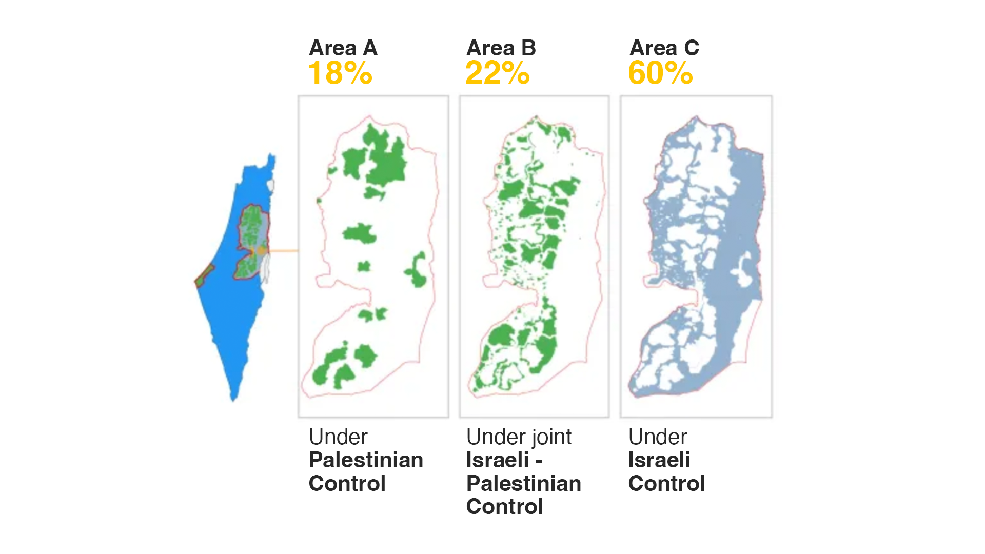 In 1995, a second Oslo Accord was signed between Israel and the PLO, dividing the occupied West Bank into Areas A, B, and C.
